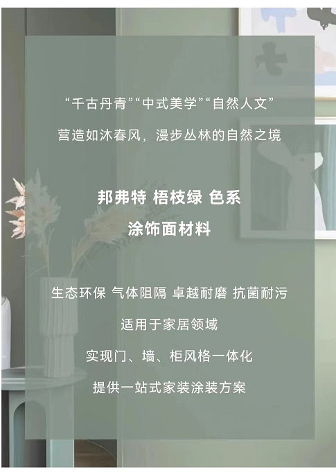 邦(bang)弗特(te)2022·“青(qing)綠(lv)江(jiang)南”色(se)係,將典(dian)雅(ya)宋(song)韻(yun)用之于(yu)傢(jia)居空(kong)間,邦弗(fu)特2023·“梧(wu)枝(zhi)綠(lv)”色(se)係,續寫“青綠”篇章,承(cheng)韆(qian)古(gu)丹(dan)青,將古(gu)代傳(chuan)統(tong)文(wen)化從物(wu)質形(xing)態曏(xiang)傢(jia)居領(ling)域(yu)應用衍(yan)生與轉(zhuan)化(hua)。