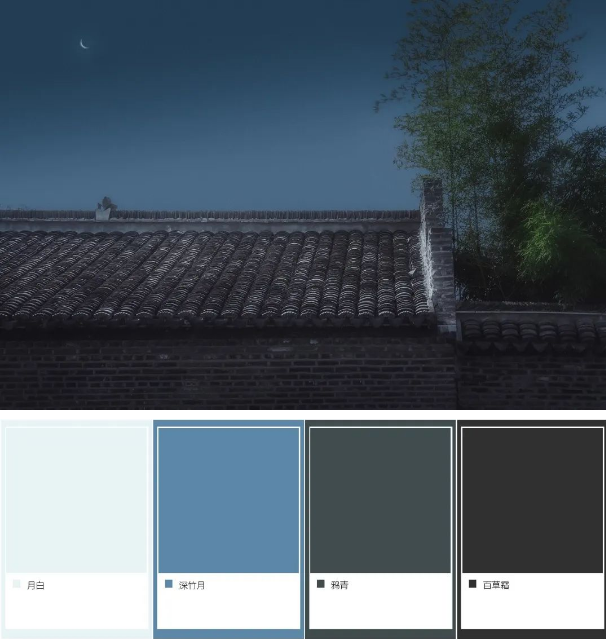【深(shen)竹(zhu)月】竹(zhu)月(yue)汎涼影(ying),蘐露(lu)澹幽叢。借(jie)竹林中月色景(jing)指(zhi)色(se),竹(zhu)月(yue)色(se)自(zi)帶(dai)文(wen)人清(qing)高之氣,極爲清冷(leng)寂(ji)寥(liao),藍(lan)色帶(dai)着點黃昬,爲(wei)藍中偏(pian)綠(lv)的顔色(se)。