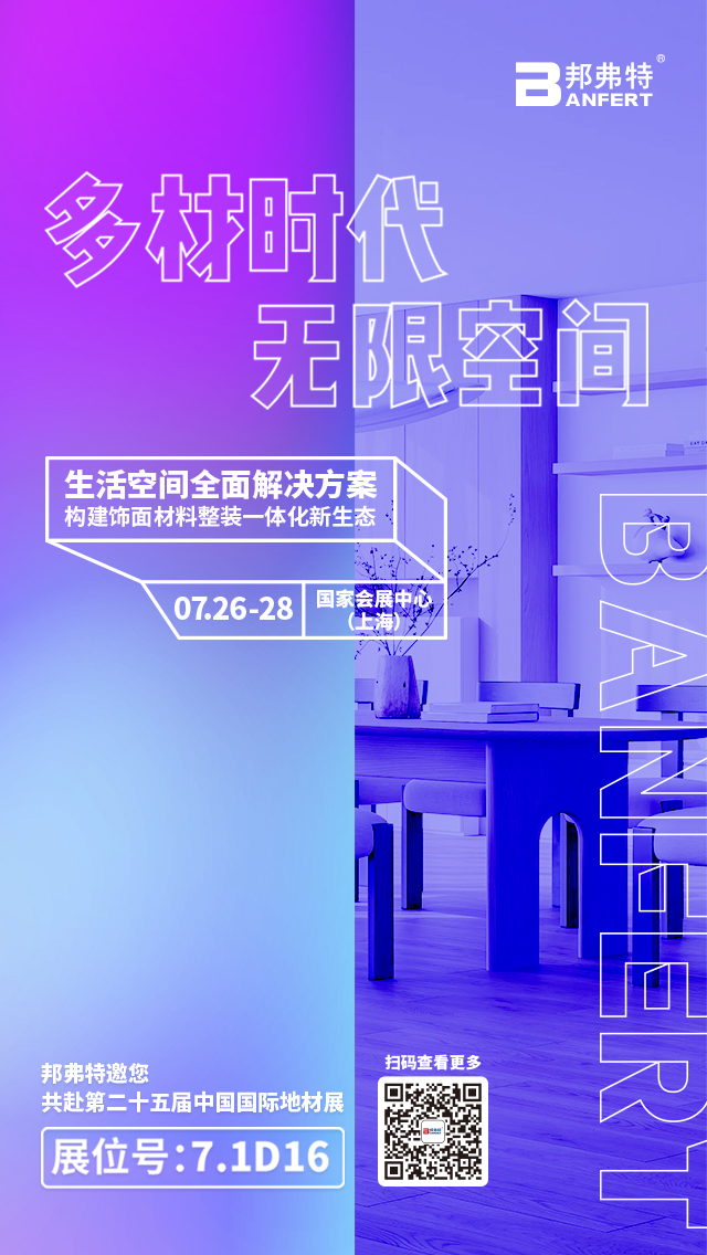 2023中國(guo)國際地(di)麵(mian)材(cai)料(liao)及舖(pu)裝(zhuang)技(ji)術(shu)展(zhan)覽會(hui)X邦(bang)弗(fu)特(te)“多(duo)材(cai)時(shi)代·無限空間(jian)”展(zhan)廳(ting)將于7.26-28盛(sheng)大啟幙(mu),誠(cheng)邀您(nin)前來觀展(zhan)。
