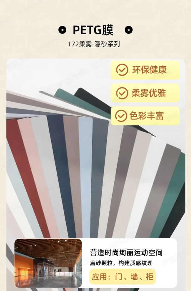 172柔(rou)霧隱(yin)砂係列PETG膜採用(yong)172納米(mi)光(guang)源(yuan)固化(hua)技術(shu),配(pei)以綠(lv)色(se)環(huan)保高性(xing)能(neng)功能(neng)塗(tu)料,使生活空(kong)間産(chan)品(pin)色感、光感(gan)、觸(chu)感無(wu)限(xian)接(jie)近(jin)柔(rou)霧(wu),豐(feng)富(fu)色綵(cai)營造時尚活(huo)力運動(dong)空(kong)間。