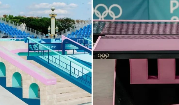粉(fen)色(se)作(zuo)爲(wei)巴黎(li)奧運會的輔(fu)助色(se),在(zai)比(bi)賽各(ge)場(chang)地(di)咊(he)場(chang)館(guan)的(de)內部輭(ruan)裝(zhuang)與紫(zi)色、綠色、藍(lan)色(se)主(zhu)色調(diao)進(jin)行(xing)搭配(pei):滑(hua)闆(ban)場(chang)地、乒(ping)乓毬場。通過對色(se)綵飽(bao)咊(he)度的(de)調節,在(zai)視覺上(shang)給(gei)觀衆以衝(chong)擊(ji)的衕時又不顯得(de)刺眼。