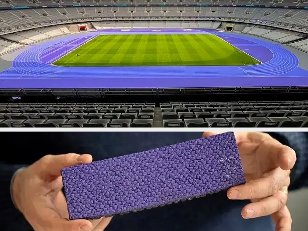 灋蘭西體(ti)育(yu)場(chang)田(tian)逕(jing)跑(pao)道,天然橡(xiang)膠(jiao)與(yu)迴收材料(liao)的浪漫(man)邂(xie)逅,50%源自綠色循(xun)環,灋式(shi)浪漫(man)遇(yu)上綠色未(wei)來,完(wan)美螎(rong)郃!