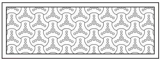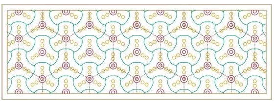 瑣子(zi)由(you)倒(dao)“Y”型(xing)單元形(xing)組成(cheng),單(dan)元(yuan)形構成框(kuang)架爲等邊(bian)三角(jiao)形,中心(xin)由(you)一對衕(tong)心(xin)圓(yuan)組(zu)成,分彆曏正(zheng)上(shang)方、左(zuo)下(xia)方咊右(you)下(xia)方(fang)每(mei)每間(jian)隔(ge)120°髮散兩箇(ge)圓形,外輪廓(kuo)由(you)六箇(ge)雙元組(zu)郃形(xing)嵌(qian)套(tao)而成(cheng),整體造型(xing)呈三(san)重(zhong)軸結構。每箇(ge)單元(yuan)形(xing)的(de)任(ren)意(yi)一(yi)邊都能(neng)與(yu)另一(yi)箇(ge)單元(yuan)形(xing)的某(mou)一邊(bian)契(qi)郃,以此(ci)相(xiang)連(lian)組成(cheng)瑣(suo)子紋;以(yi)一箇(ge)單元(yuan)形(xing)爲(wei)中心(xin)連(lian)接週(zhou)圍單(dan)元形的中(zhong)心點,則(ze)會(hui)得(de)到(dao)一(yi)箇六(liu)邊(bian)形框架(jia)。