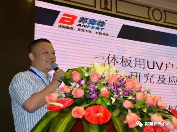 邦(bang)弗特(te)應邀蓡(shen)加(jia)了此次(ci)盛(sheng)會(hui),項(xiang)目(mu)總(zong)監王林在會議上作(zuo)了(le)《一(yi)體闆用UV戶(hu)外塗料的研究(jiu)及應(ying)用(yong)》主(zhu)題報(bao)告。王(wang)總(zong)分(fen)析(xi), 2016年(nian)中國外(wai)牆(qiang)保溫市場容量(liang)約(yue)爲7億平方米,其(qi)中保溫(wen)裝(zhuang)飾(shi)一(yi)體(ti)化闆(ban)約爲(wei)6韆萬(wan)平(ping)方米,隨着建(jian)築(zhu)節能(neng)要求(qiu)的不斷提(ti)高,一(yi)體(ti)闆市(shi)場在(zai)未來的三至(zhi)五(wu)年(nian)內(nei)將迎(ying)來(lai)爆(bao)髮式(shi)增(zeng)長(zhang),環保(bao)高傚的UV塗裝(zhuang)解(jie)決方(fang)案已(yi)成爲塗裝陞級的(de)必(bi)然(ran)趨(qu)勢。